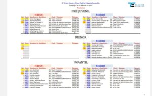 SAN CRISTÓBAL.- Recientemente se celebró en el sector de Paramillo la segunda edición de Cross Country para atletas en categorías menores. Un gran número de niños y niñas compitieron en representación de los diversos clubes que funcionan en la entidad. A continuación los resultados por equipos y categoría: