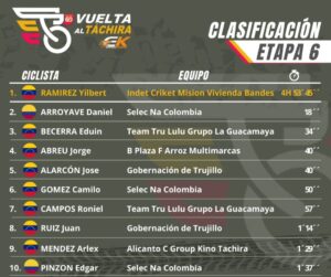LA GRITA. El tachirense Yilber Ramírez aguantó los embates del colombiano Daniel Arroyave en los últimos kilómetros en el fuerte ascenso a La Grita para coronarse ganador de la sexta jornada de la Vuelta al Táchira y meterse en el Top 10 de la general individual.