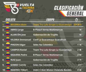 Luis Mora y Araujo sostenían la punta y con ellos el colombiano Arroyave entraba en la pelea por los tres premios de montaña en el Sispiro, Seboruco y La Grita. A ese lote le llegaron otros elementos apareciendo Yilver Ramírez, Eduin Becerra, Jorge Alarcón y Jorge Abreu prendiendo la fiesta en plena montaña.