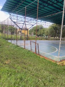 Las canchas dicen todavía Gustavo Delgado, con capas de pintura que data de hace 10 años. Las cercas perimetrales rotas e inclinadas, así como los columpios y los sube y baja. Los tableros y aros están partidos en la base.