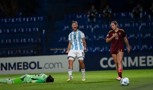 Las argentinas dispusieron de una presión alta sobre el conjunto venezolano que les rendió sus frutos en el minuto 50 cuando un fallo en salida del conjunto caribeño permitió que la jugadora María Algelt pusiera arriba a las favoritas.