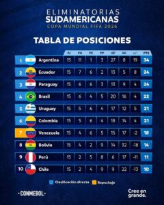 En la última curva de las eliminatorias al Mundial, la emoción parece será hasta el final, porque ahora cobra mayor fuerza lo que pueda suceder en la jornada del martes cuando este acordeón que es la tabla de clasificación puede permitir acortar o ampliar distancias entre las selecciones que luchan tres cupos directos más el repechaje que es el puesto séptimo que por ahora tiene el cuadro nacional. Argentina, Paraguay y Ecuador ya aseguraron boleto a la cita mundialista.
