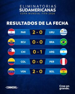 Con la victoria lograda en Maturín en un Monumental repleto hasta la bandera al equipo dirigido por el argentino Fernando Batista le sonrió el resultado de lo que se vivió en Barranquilla, Asunción y Santiago. Es decir, la Vinotinto jugaba a cuatro bandas, porque el 0-1 de Argentina sobre Chile, el 2-0 de Paraguay a Uruguay y el empate 0-0 entre Colombia y Perú le permite al once nacional quedar apenas a 3 puntos de los cafeteros y charruas, además que frenan las aspiraciones de los australes.