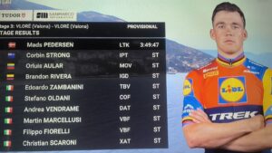 ESPECIAL.- Como aconteció en la primera etapa, el venezolano Orluis Aular se metió en el grupo de punta en los kilómetros finales de la tercera etapa del Giro de Italia y pudo sostener el endemoniado sprint final para tomar su segundo podio, quedando en la tercera posición superado por el danés Pedersen y el israelí Strong.