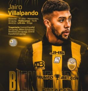 La cuenta del Deportivo Táchiara anunció la llegada de otro jugador de origen uruguayo. Se trata de Jairo Villalpando, un volante de apenas 25 años que ha tenido pasantías por varios equipos del país sureño. Villalpando ha jugado en cuatro elentos charrúas, aunque no son equipos de los considerados élite en ese país. Este volante de perfil derecho y buena pegada llega bajo la «bendición» del técnico Recoba tal como lo hizo el defensor Fratta.