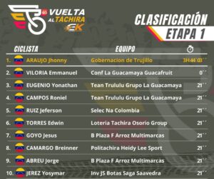 San Cristóbal. – El ciclista venezolano Jhonny Araujo Gob. Trujillo) se impuso en el sprint final de la primera I etapa y se colocó el maillot amarillo de líder de la Vuelta al Táchira 2025.