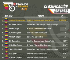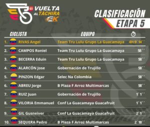 El gran beneficiado en esta quinta etapa fue Enmanuel Viloria, un trujillano quien releva a Araujo en la cima de la general aunque tendrá que lidiar con una jauría de corredores con ganas de sacarlo de esa posicion como Alarcón y el propio Roniel Campos triplecampeón del giro tachirense que quiere emular la gesta de José Rujano y este viernes en el ascenso a La Grita pinta para recortar diferencias y quedar a tiro del primer lugar.