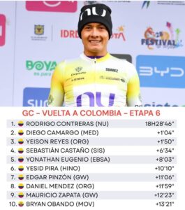 SAN CRISTÓBAL.- Más de 6 horas tardó Yeison Reyes para coronar el triunfo en el Alto de la Línea. Tras un recorrido de 231.3 kilómetros entre Mosquera, Cundinamarca y Alto de la Línea, en Tolima, se realizó la sexta etapa de la edición 75 de la Vuelta a Colombia en Bicicleta, extenuante jornada que ganó Yeison Sebastián Reyes, (Orgullo Paisa), con tiempo oficial de 6:04.00.