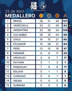 En Rosario, Argentina, la delegación criolla escaló un peldaño al ubicarse en la cuarta posición con 26 medallas de oro, 19 de plata y 34 de bronce y, ahora en Panamá la juventud venezolana vuelve a ser protagonista al desbancar a la delegación argentina de la segunda posición que ocupó los primeros 13 días de competencias.