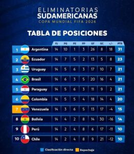 En El Alto, Uruguay echó una «manita» y con el empate 0-0 dejó a Bolivia estancada en la octava casilla, un punto por debajo de la Vinotinto y es el rival a vencer en la próxima jornada; en Santiago, Ecuador también arrebató un punto a Chile y prácticamente lo deja fuera de la carrera por el repechaje como igual acontece con los peruanos, ambos en 10 puntos, a 5 puntos por debajo de la selección venezolana.